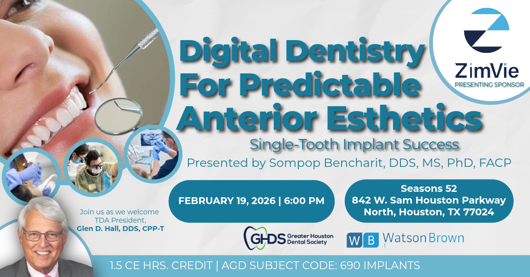 Join us as we welcome TDA President, Glenn D. Hall, DDS, CPP-T CE Program – Digital Dentistry for Predictable Anterior Esthetics – Lecture Presented by Sompop Bencharit, DDS, MS, PhD,